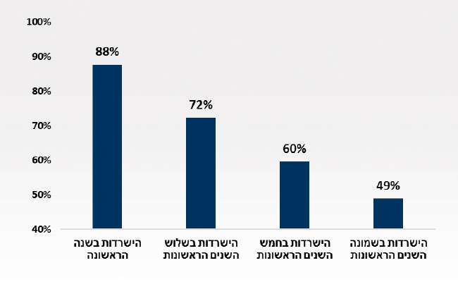 מניתוח הנתונים לאורך השנים עולה כי בממוצע, שיעור ההישרדות של העסקים הקטנים בישראל הציג שיפור ביחס למצבם לפני כעשור. כך למשל, לפני כעשור, שיעור ההישרדות של עסק בשנתו הראשונה עמד על כ- 78%, בעוד שכיום 88% מהעסקים שורדים את השנה הראשונה לפעילותם.