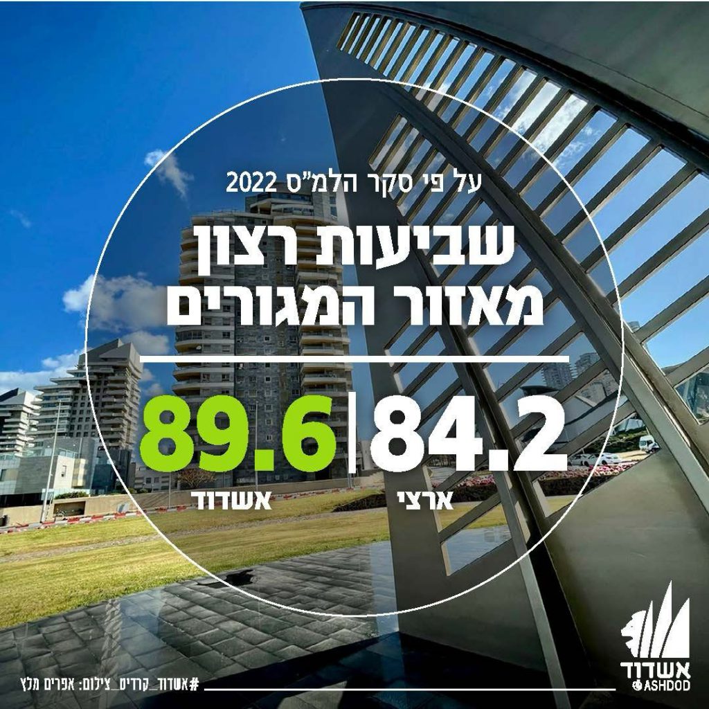 הקמת הפארקים, העצמת אירועי התרבות, הטיפוח הסביבתי, שדרוג המרחב האישי-ציבורי, והגברת הביטחון האישי באמצעות מצלמות ותאורה מתקדמת מציבים את אשדוד בצמרת הערים בישראל שתושביהן מרוצים מהן – על פי דוח הלשכה המרכזית לסטטיסטיקה לשנת 2022. מדובר בעלייה לעומת השנה שעברה, ונתונים גבוהים מממוצע הארצי העומד על 84 אחוז