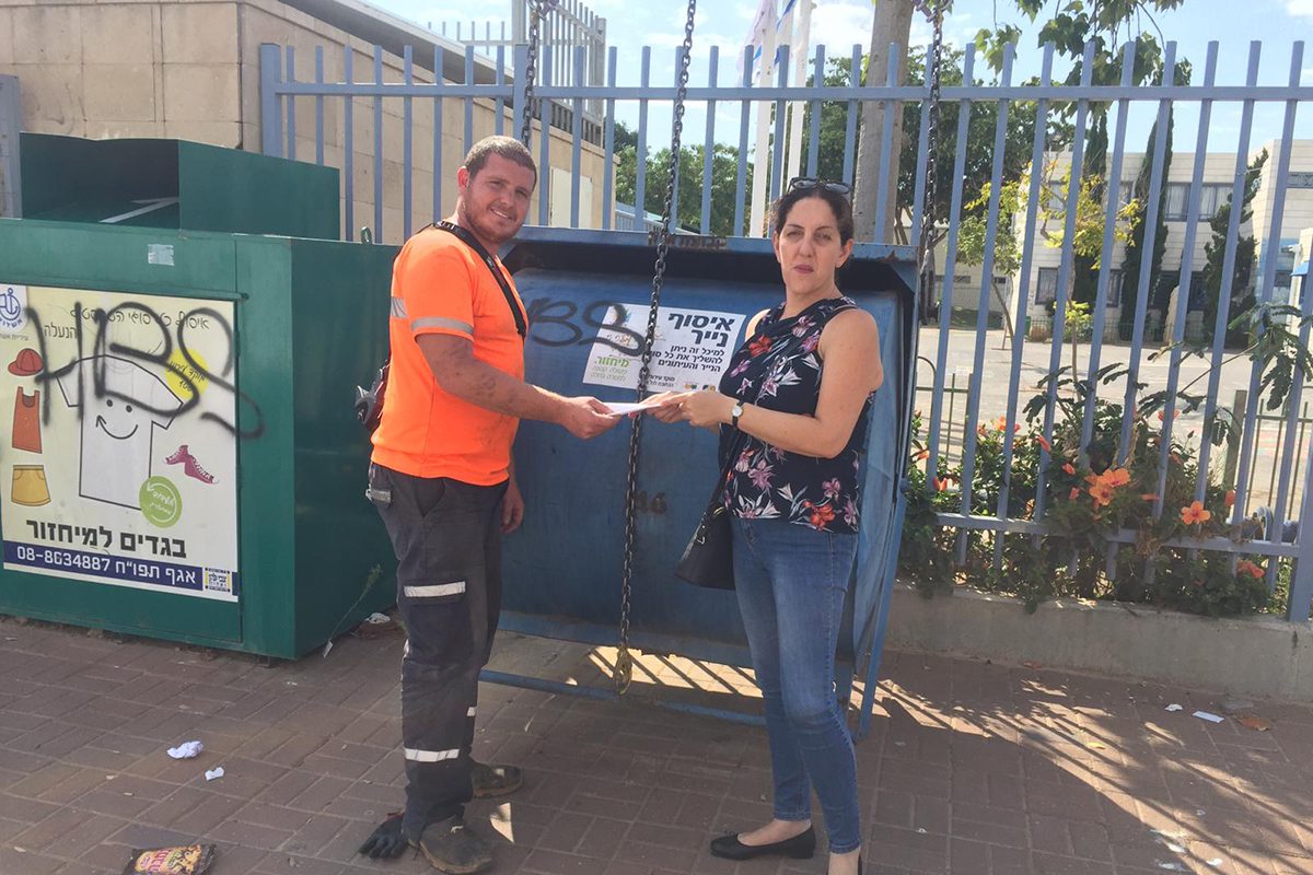 בשבוע שעבר פנה תושב בשם יוסי בירנבוים למזכירת המחלקה באגף שירותי הניקיון, גב' בטי שלו, וסיפר כי בנו זרק בטעות מסמכים חשובים לתוך מתקן נייר. בטי הפנתה אותו למנהל המיחזור מר מאיר חדד להמשך טיפול. לאחר רישום הפניה במוקד העירוני, חדד יצר קשר עם קבלן 'נגב אקולוגיה' האחראית על מתקני המיחזור ובנוכחות התושב רוקנו את המתקן וחיפשו את האבדה.
