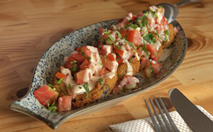 חציל טמפורה – פרוסות חציל בציפוי טמפורה ופירורי פנקו ומעל טחינה ביתית ועגבניות פיקנטי.