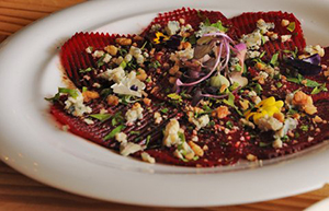 קרפצ'יו סלק – דפי סלק בכבישה קרה, בלסמי מצומצם ושמן זית, גבינת רוקפור, קרם סלק, אגוזי מלך ופרחי אכילה.