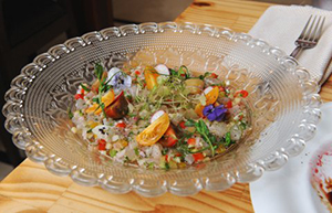 סביצ'ה ים תיכוני – דג מוסר ים טרי, ירקות קצוצים, סלרי, תפוח עץ ירוק, עגבניות שרי בצבעים, קונפי שום, צנוניות, טבסקו ופרחי אכילה.