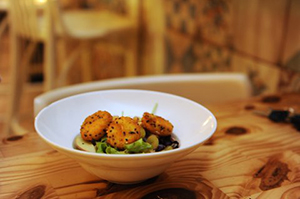 סלט קייצי – שלל חסות, חצאי ענבים, פרוסות נקטרינה, אגוזים מסוכרים, חמוציות, גבינת עיזים בציפוי פנקו בזילוף רוטב ויניגרט הדרים.