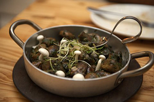 פטריות מוקפצות – שמפיניון ופורטבלו טריות בפסטו, שמן זית ושום בעיטור פטריות שימג'י טריות.