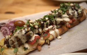שווארמה דג – רצועות דג ים טריות מוקפצות בתיבול שווארמה אותנטי, סלט עגבניות פיקנטי, טחינה, מוגש על פוקאצ'ה שזופה.