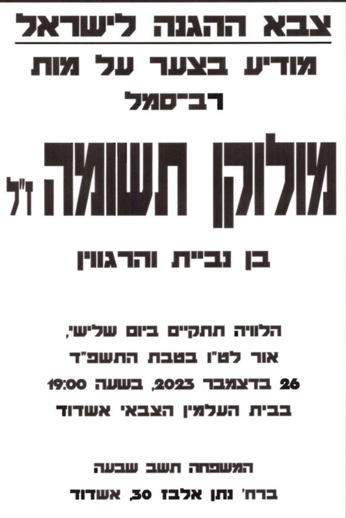 "הערב ליווינו בצער ובשיברון לב למנוחות עולמים, את רס"ל (במיל.) מולוקן תשומה, שנפל במילוי תפקידו בבקעת הירדן.