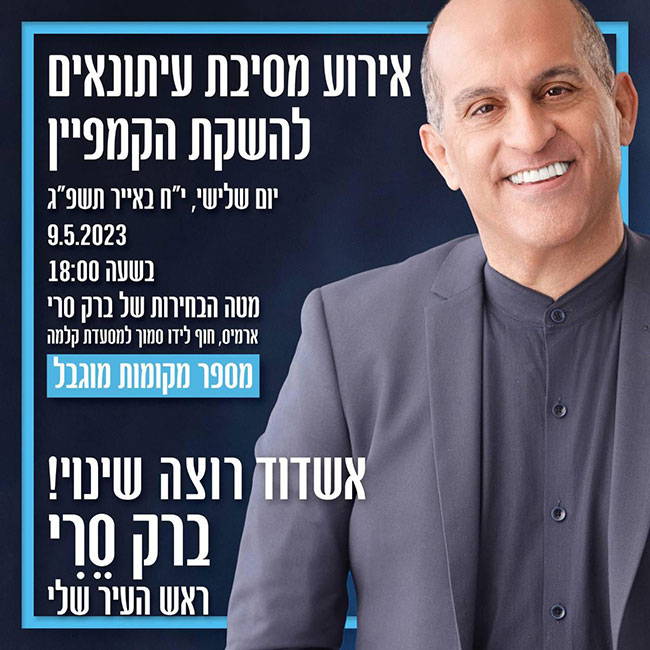 המתמודד המסקרן לראשות העיר ברק סרי שהכריז רשמית על ריצתו לראשות העיר אשדוד ערב חג הפסח ייכנס מסיבת עיתונאים רשמית לפתיחת הקמפיין ביום שלישי הבא ובאותה ישיק את המטה החדש שנשכר לתקופת הבחירות במסעדת ארמיס לשעבר על חוף הים.