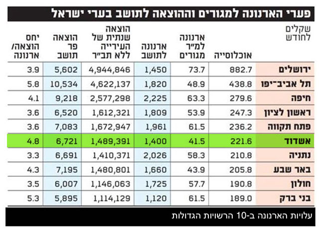 ראש עיריית אשדוד ד״ר יחיאל לסרי לא יכל לחלום על נתון סטטיסטי נח מזה לפתוח את קמפיין הבחירות שלו. נתוני הארנונה בעשר הערים הגדולות בישראל, מלמדים שהארנונה באשדוד היא הנמוכה ביותר ועומדת על 41.5 ש"ח למ"ר בלבד!!! כך עולה מניתוח השוואתי שערך העיתון גלובס, ובהשוואה לערים אחרות מדובר בפער הפרשים גדול במיוחד. אשדוד מוכיחה שוב כי אין צורך להעלות את תעריפי הארנונה הקיימים כדי לפתח את העיר, להעניק שירות מיטבי לתושב ואפילו לסיים בעודף תקציבי.