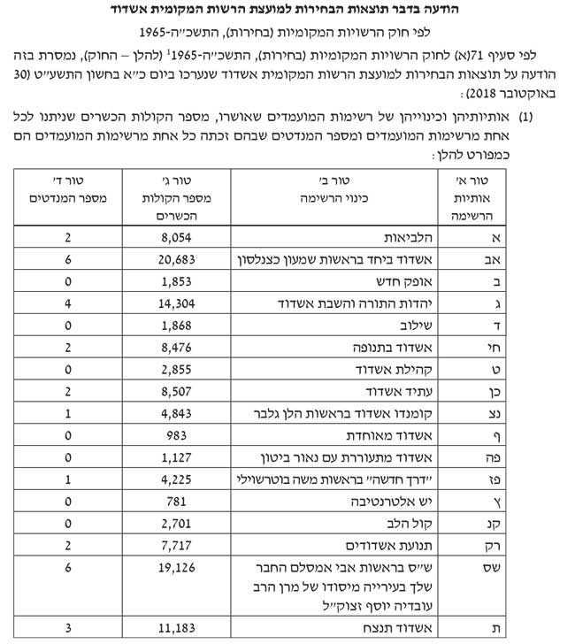 גם במערכה הזו יש מפסידים גדולים ומרוויחים גדולים, אין ספק שהמפסיד הגדול הוא בוריס גיטרמן שלא הצליח להיבחר אחרי 2 קדנציות כסגן ראש עיר, את הקולות שתה בלגימה אחת אלי נכט, גם הלן גלבר שאמנם שמרה על כוחה אך אימצה את המשפט ״כגודל הציפייה כך גודל האכזבה״. סך הכל היתה חברת אופוזיציה ותמשיך חברת אופוזיציה. ש״ס גדלה בשליש וכמובן, הלביאות, אשדודים ואלי נכט שנכנסו לראשונה למועצת העיר עם 2 מנדטים כל אחד הם ההפתעה החיובית של המערכה.