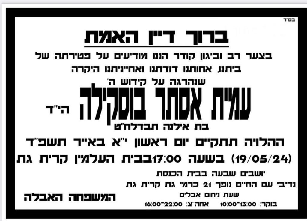 כמה קיווינו, כעיר וכבודדים/ות שהסוף יהיה אחר, שמשהו טוב יקרה בתוך כל השואה שנכפתה עלינו, היתה לנו כעיר חטופה אחת אליה התפללנו בחצי השנה האחרונה וביום שישי הגיעה בשורת האיוב, עמית בוסקילה חזרה בארון, ישירות לבית העלמין בקרית גת שם תיטמן הערב בשעה 17:00 קרובה למשפחתה השם יקום דמה