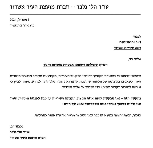 עו"ד הלן גלבר שיגרה שאילתה דחופה לרה"ע, יחיאל לסרי על רקע הכוונה לקצץ באבטחת מוסדות חינוך וגני ילדים בעיר. "נדהמתי לראות כי במסגרת הקיצוץ הרוחבי בתקציב העירייה, מקוצץ גם תקציב אבטחת מוסדות חינוך כשאנחנו בעיצומה של מלחמה שהופכת אותנו ואת העיר שלנו ליעד לפח"ע. מיותר לציין כי זו העת להגביר תקציב ומאמץ כדי לשמור על שלום הילדים", כותבת עו"ד גלבר. בעבר כבר אישרה העירייה הצעה לסדר של עו"ד גלבר כהחלטה להגביר אבטחה על מוסדות חינוך הסמוכים לאתרי בניה.