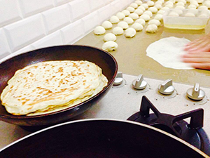 2. יוצקים מהבצק הרך והדביק כדורים בגודל כדורי פינג-פונג ומשהים 15 דקות. מכניסים לקערה עם שמן, מוציאים כדור אחר כדור ומשטחים על משטח שיש משומן בעזרת ידיים משומנות לעלה בקוטר כ-25 ס"מ.