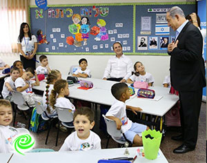 מר בנימין נתניהו שוחח עם הילדים הרכים והדגיש את חשיבות לימוד השפה העברית והקשר אל מורשת ישראל, את לימוד שפת המספרים לביסוס מקצועות החשבון והמדעים ולימוד האנגלית כחלק מהשפה הבינלאומית והקשר עם מדינות המערב המפותחות. בסיום המפגש הראשון התכבד ראש הממשלה להיכנס לכיתה א' ולהעביר לתלמידים שיעור אישי, במהלכו שוחח איתם על תחביביהם וצפיותיהם מבית הספר, מחבריהם ומעצמם. ראש הממשלה עמד על הקשר שבין ציונות ומצוינות. הוא דיבר על בניית הארץ וביסוס המדינה וביקש מהילדים להיות טובים יותר בכל מה שהם עושים.