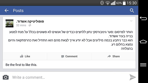 ״הותר לפרסום: סער גינזבורסקי נתון ללחצים כבדים של אנשים לא פשוטים בכלל על מנת למנוע בנייה בעיר אשדוד. הוא נתבע בכמה מליונים אבל לא יודע איך לצאת מהם, הוא התחיל זאת כהרפתקאה והיום הוא נמצא בחלום רע. בהצלחה״.