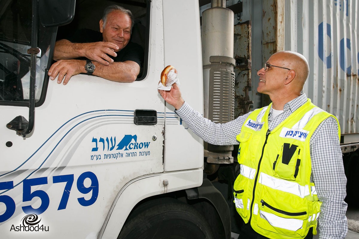 חברת נמל אשדוד ציינה בשבוע שעבר, זו השנה התשיעית ברציפות, את 'יום המוביל' ברחבי הנמל. סמנכ"ל התפעול איציק כהן יצא לשערי הנמל במטרה לפגוש את נהגי המשאיות שמגיעים לנמל. (תמונה מצורפת – צילם: פבל טולצ'ינסקי)