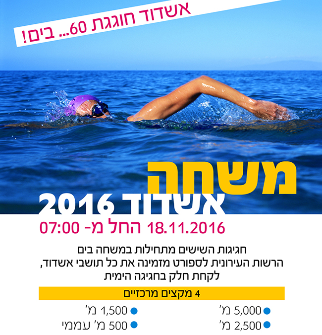 כמה טבעי שאת חגיגות ה-60 תפתח אשדוד דווקא בים, סימנה המובהק והנצחי של אשדוד. יותר מכל דבר אחר מסמל הים את כל אחד ואחת מאיתנו. ״משחה הים״ שיתקיים לראשונה באשדוד ב-18 בנובמבר הוא האירוע שנועל את שנת הפעילות של הרשות העירונית לספורט ופותח את חגיגות ה-60 של העיר אשדוד. זוהי הזדמנות קורצת לעשות סוג של היסטוריה ולקחת חלק באירוע הראשוני והמיוחד הזה.
