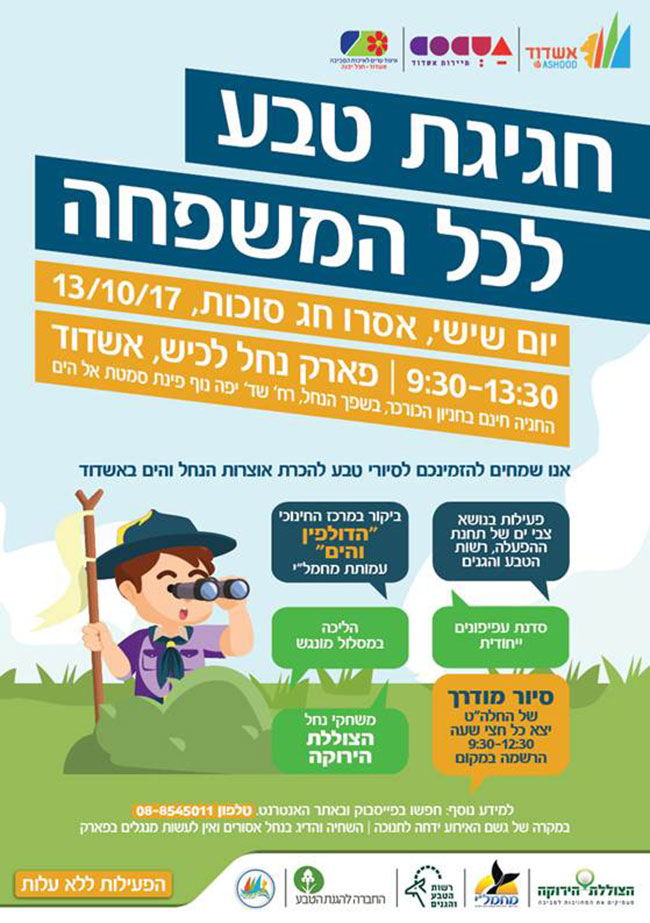 החברה לתיירות אשדוד, איגוד ערים ומחלקת איכות הסביבה שמחים להזמינכם לחגיגת סיורי טבע עירוני חוויתיים לכל המשפחה, כולל ביקור ב"מרכז החינוכי הדולפין והים" של מחמל"י, שיערך באיסרו חג סוכות – יום שישי 13/10/17 בין השעות 9:30-13:30