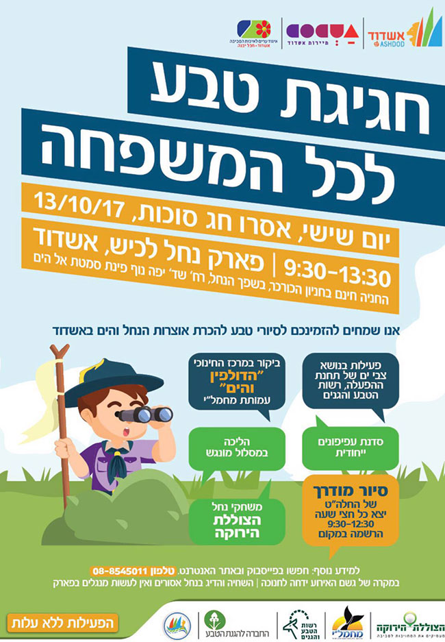 החברה לתיירות אשדוד, איגוד ערים ומחלקת איכות הסביבה, מזמינים אתכם לחגיגת סיורי טבע עירוני חוויתיים לכל המשפחה כולל ביקור ב"מרכז החינוכי הדולפין והים" של מחמל"י שחוגג בדיוק היום שנה להיווסדו. הסיורים בהדרכת החברה להגנת הטבע.