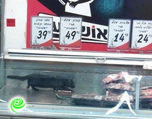 לא ברור איך החתול השחור הצליח להכנס לסניף ולהשתחל לתוך הקצבייה והויטרינה ובזמן קניות שיא של מוצרי בשר, סמוך כל כך לראש השנה.