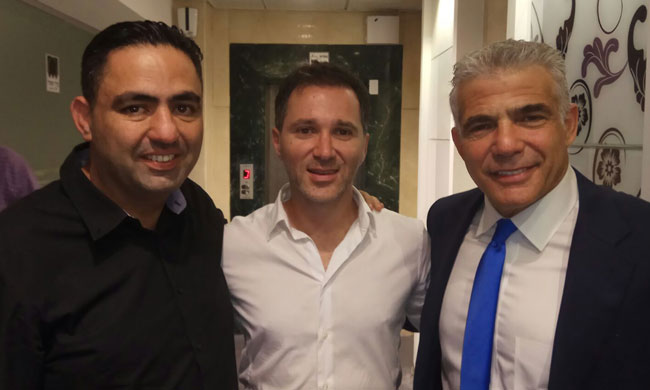 לפיד עם יו״ר מטה אשדוד דוד קקון ודניאל חוטובלי, פעיל המפלגה
