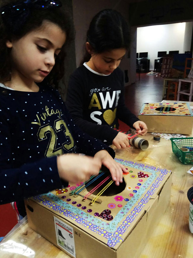 בכיתת המגמה במוזיאון אשדוד לאמנות יוצרים תיבות צלילים מקופסאות נעליים ומקלות גשם. הילדים מגיעים לחדר המגמה במוזיאון ויחד עם המדריכה סימה ששון מהמוזיאון יחד עם מתנדבים– בני נוער בגילאי 15-17 ממגמת האמנות בבתי הספר התיכונים בשונים בעיר שמגיעים במסגרת מחויבות אישית, מנחים את הילדים עוזרים להם ומלווים אותם בתהליך היצירה שכולל שימוש בטושים, צבעים, מדבקות צבעוניות, גומיות, סרטים דביקים צבעוניים, סיכות מתפצלות ועוד.