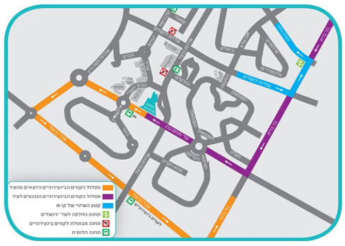 קווים מספר: 17 ,43 ,140 ,141 ,142 ,150 ,151 ,152 ,220 ,284 ,292 ,315 ,317 ,319 ,320 ,324 ,330 ,קווים בין עירוניים יצאו מהתחנה המרכזית לשד' בגין עד כיכר המפרשים, יפנו שמאלה למשה דיין, שמאלה לשד' עובד בן עמי, שמאלה לשד' בני ברית וימשיכו לפי המסלולים המקוריים. תחנה חדשה להעלאה ולהורדה של נוסעים לקווים לעיל תמוקם בשד' בן עמי/הרצל.
