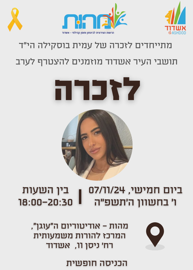 ביום חמישי הקרוב 7/11/24 נקיים טקס לזכרה של עמית בוסקילה הי"ד. הטקס יתקיים בין השעות 18:00-20:30 במהות ,אודיטוריום ה'עוגן' המרכז להורות משמעותית.