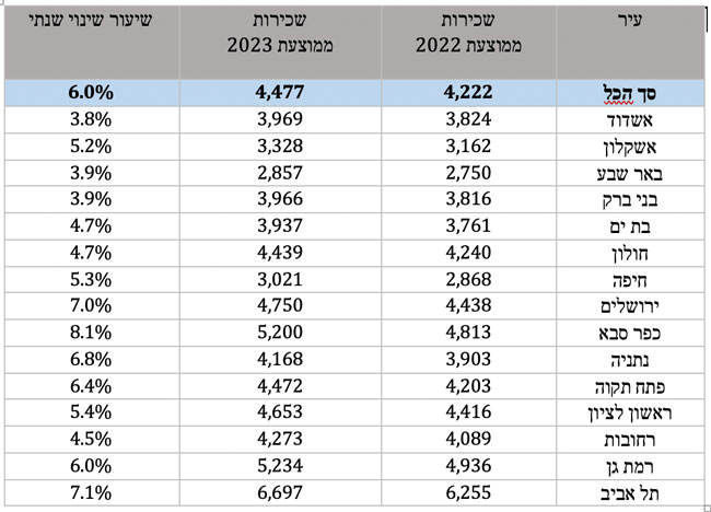 השכירות הממוצעת הגבוהה ביותר נרשמה בתל אביב , כ- 6,697 ₪ לחודש, עלייה של 7.1% בהשוואה לשנה שעברה. אחריה מדורגת רמת גן עם שכירות ממוצעת של 5,234 עלייה של 6% בהשוואה לשנת 2022.