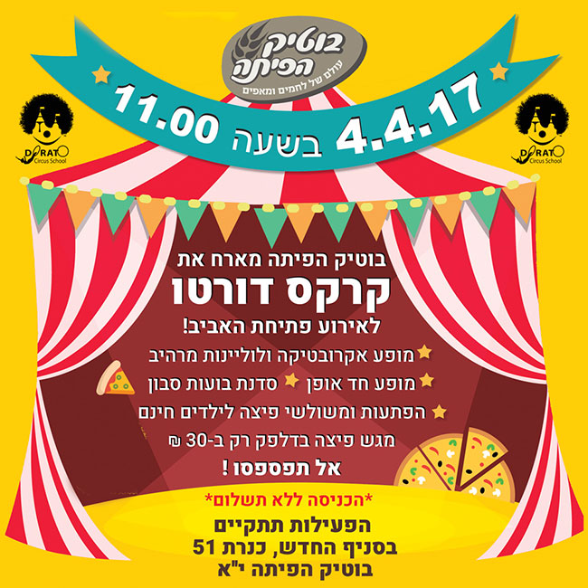 רשת "בוטיק הפיתה" תפעיל ביום ג׳ בסניף הרשת במרכז יא (כנרת 51) הפנינג מיוחד לילדי הרובע והסביבה. מתחם מיוחד שהוכשר בו יתקיימו מופעי קרקס, סדנת בועות, הפתעות לילדים ו…פיצה במבצע מטורף – 30 ש״ח למגש (בדלפק)