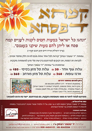 לקראת חג הפסח יש פניות רבות ועמותת "יד יששכר ויצחק" רוצה לחלק סלי מזון לקראת החג ל-1500 משפחות, ובכך להאיר להם את שמחת החג!