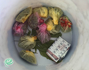 הבלשים ערכו חיפוש בתוך הדירה ומצאו בעיקר בחדר השינה: כ-35 אצבעות של חומר החשוד כסם מסוג 'חשיש', 10 שקיות ובתוכן חומר החשוד כסם מסוג 'הידרו', עלי מריחואנה בתפזורת, חומר החשוד כסם מסוג 'קריסטל'. חלק מהסמים נמצאו בתוך דלי פופקורן ששימש להסוואה וחלק אחר במקומות שונים בדירה. בנוסף נמצא במקום כסף מזומן בסך 2000 ₪.