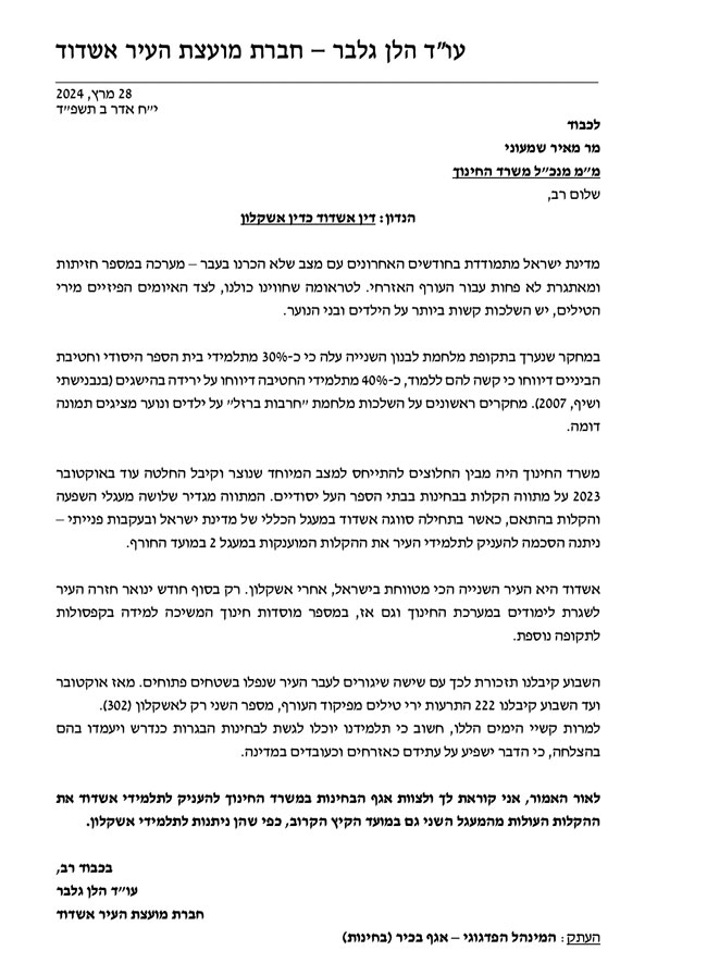 "אשדוד היא העיר השנייה הכי מטווחת בישראל, אחרי אשקלון", כותבת עו"ד גלבר. "השבוע קיבלנו תזכורת לכך עם שישה שיגורים לעבר העיר שנפלו בשטחים פתוחים. מאז אוקטובר ועד השבוע קיבלנו 222 התרעות ירי טילים מפיקוד העורף, מספר השני רק לאשקלון (302). לטראומה שחווינו כולנו, לצד האיומים הפיזיים מירי הטילים, יש השלכות קשות ביותר על הילדים ובני הנוער".