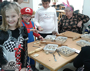 תלמידי בית הספר המחופשים ומצוידים בהרבה מאוד שמחה ורצון טוב, התחלקו לקבוצות ויצאו עם המורים והצוות החינוכי לקהילה. קבוצה אחת יצאה אל מועדון גיל הזהב וביחד עם באי הבית הם הכינו אזני המן מילאו אותם בשוקולד ופרג והצטרפו למקהלת הבית לביצוע כמה משירי החג.