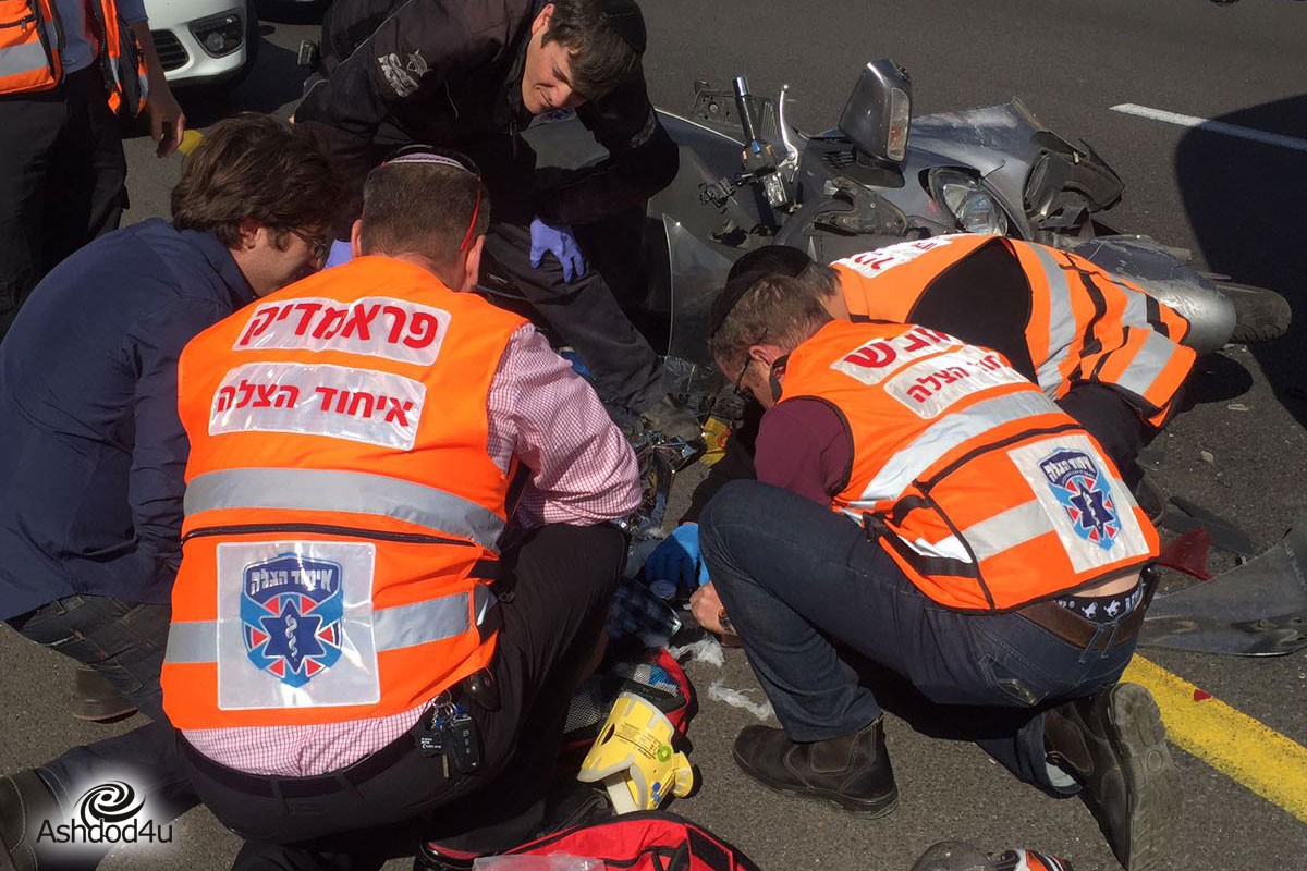 צעיר שרכב על אופנוע נפצע בינוני בתאונה עם מעורבות רכב פרטי ברחוב החרמון באשדוד. מתנדבי רפואת חירום של איחוד הצלה סניף לכיש העניקו לו טיפול רפואי ראשוני בזירת התאונה כשהוא סובל מחבלות ופציעות בגפיים ובפלג גופו העליון.