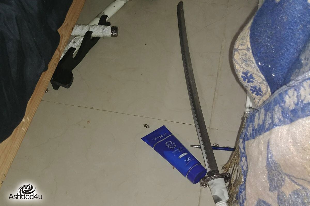 בעת שפונתה המתלוננת החבולה אל בית החולים ניגשו השוטרים אל הדירה בה נמסר כי שוהה החשוד. כבר בכניסה לדירה הבחינו השוטרים בכתמי דם, מגבת מגואלת בדם וחרב סמוראי גדולה מונחת על הרצפה. בשלב זה נכנס החשוד אל חצר הבית והחל מקלל את השוטרים בשפה הרוסית תוך שאף מאיים על השוטרים כי יפגע בהם. השוטרים הצליחו להשתלט על החשוד ששהה ככל הנראה בגילופין וזה נעצר והועבר לחקירה בתחנת המשטרה באשדוד. גם כשהובא החשוד אל התחנה, לא חדל מדברי האיום לעבר השוטרים ואף תקף את אחד מהם תוך שנגח בפניו בעת שזה ביקש להוציאו מתוך ניידת המשטרה. כאמור, היום תבקש המשטרה להאריך את מעצרו של החשוד בבית המשפט.