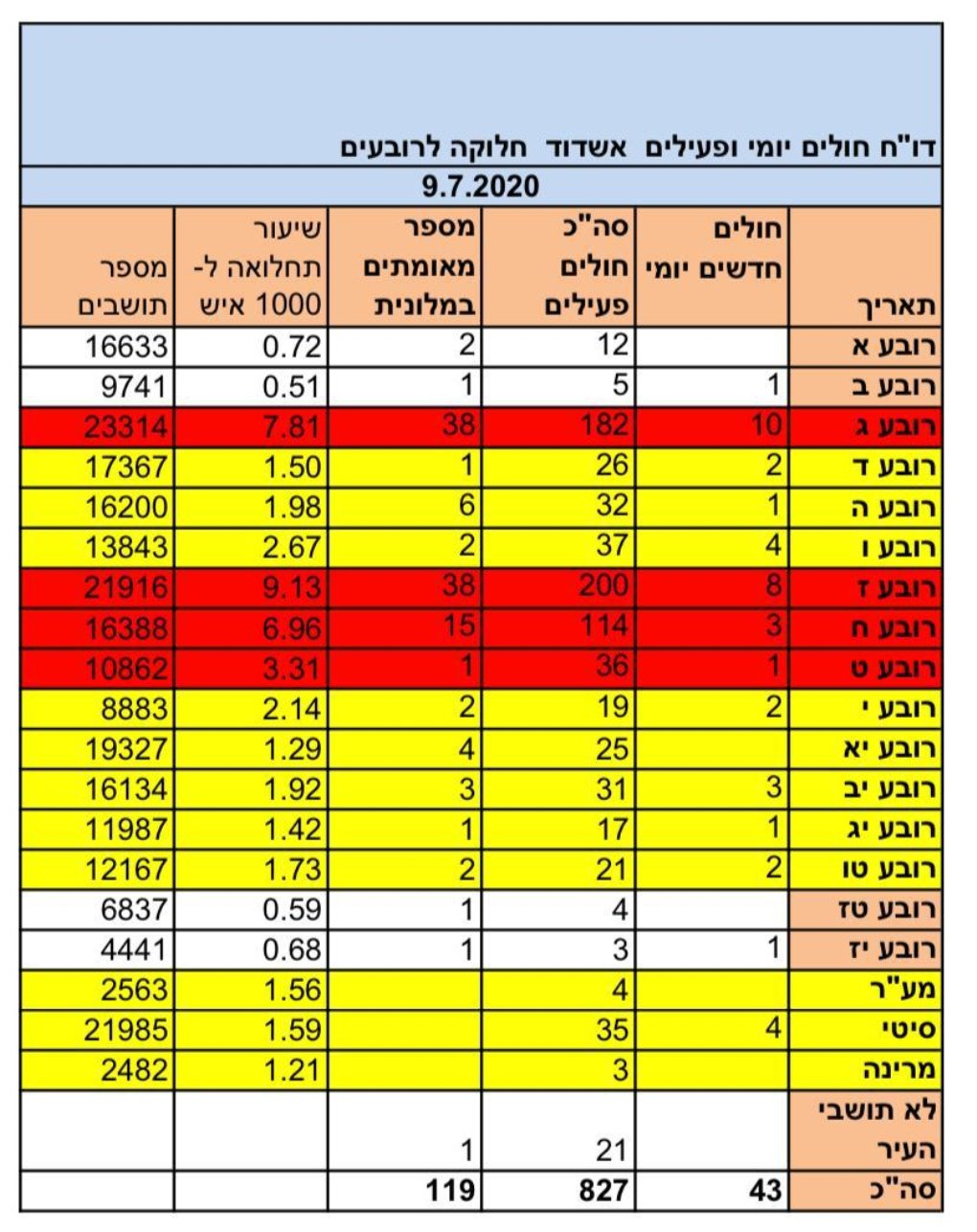 מהנתונים שמפרסמת הצהריים עיריית אשדוד, עלה מספר הנדבקים ברובעים האדומים, לפי הפירוט הבא: