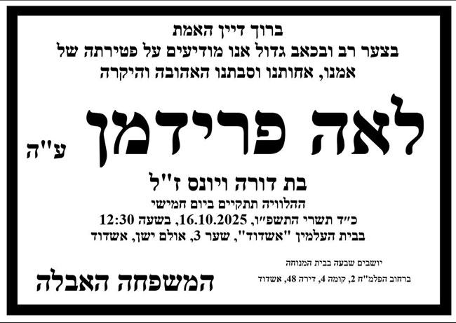 הלווייתה של לאה פרידמן תתקיים היום (ראשון) בשעה 12:30 בבית העלמין הישן באשדוד.