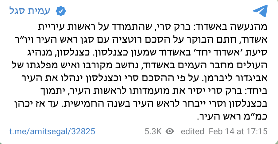אשדוד מתעוררת. כפי שצפינו, וכתבנו בתקופה האחרונה גם המועמדים לראשות הבינו שאין מנוס מאיחודים ושת״פים, הסנונית הראשונה מגיעה מכיוון מפתיע ובפורמט מוזר שקורה בפעם הראשונה באשדוד, שת״פ שלטוני בין ברק סרי ושמעון כצנלסון מצהירים על איחוד, כצנלסון וסרי ירוצו בנפרד למועצת העיר כל אחד עם רשימתו: ברק סרי בראש סיעת״אשדוד מתקדמת״ וכצנלסון ירוץ בראש רשימתו ״אשדוד ביחד״. על פי הסיכום, כצנלסון וסרי יפעלו ביחד במו״מ הקואליציוני כדי לשמור על אופייה וצביונה הליברלי ולקדמה בכל התחומים.
