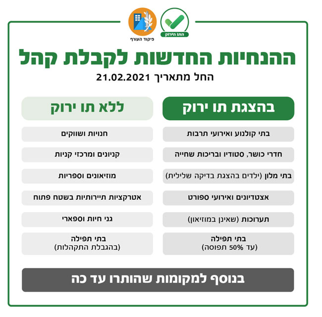בנוסף, פיקוד העורף קבע בהנחיות החדשות מיום 21.2.21  כי ניתן לפתוח שווקים ללא התו הירוק.