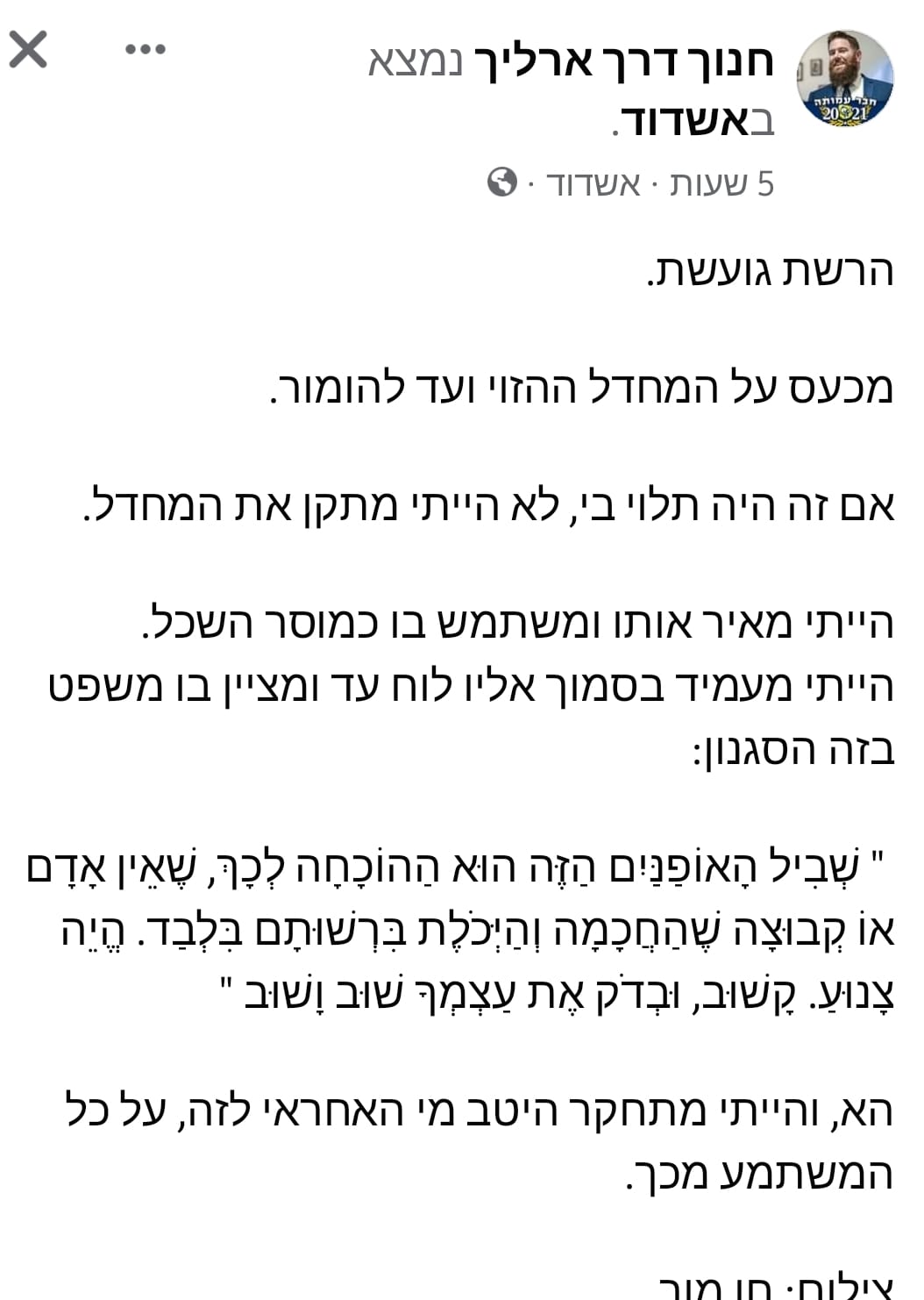 חבר מועצת העיר חנוך דרך ארליך שממונה על החברה לפיתוח אשדוד תפס טרמפ על הוירליות הלא מחמיאה של הפוסט למרות שאין לו שום יד ורגל בפרוייקט ומציע ספק בציניות ספק בסוג של התנשאות ״אם זה היה תלוי בי לא הייתי מתקן את המחדל״ כתב בפוסט הייתי מאיר אותו ומשתמש בו כמוסר השכל כתב ולא שמישהו שאל אותו מה הוא חושב או מה היה עושה, פשוט התפרץ עם דעתו תוך התעלמות מזעמם של יותר מ-200 מגיבים שמוחים בצדק על אוזלת היד של העירייה במקרה המביש הזה והרי כולנו יודעים שלא מדובר במקרה בודד, פשוט בשאר המקרים לא הכניסו לנו גם אצבע בעין. טוב עשה חבר המועצה דרך בפסקת הסיום שהציע לתחקר היטב מי האחראי לזה, על כל המשתמע מכך.