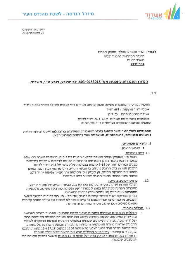 עיריית אשדוד ונציגי התושבים הגישו ב20 לספטמבר התנגדות משותפת לתכנית הבינוי המקורית של מתחם "לב הרובע" בטו'