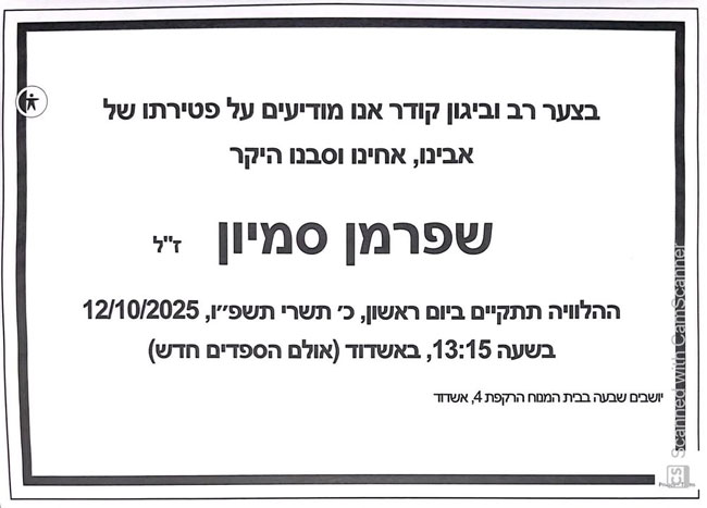 הלווייתו תתקיים היום (12.10.2025) בשעה 13:15 באולם ההספדים החדש בבית העלמין באשדוד.