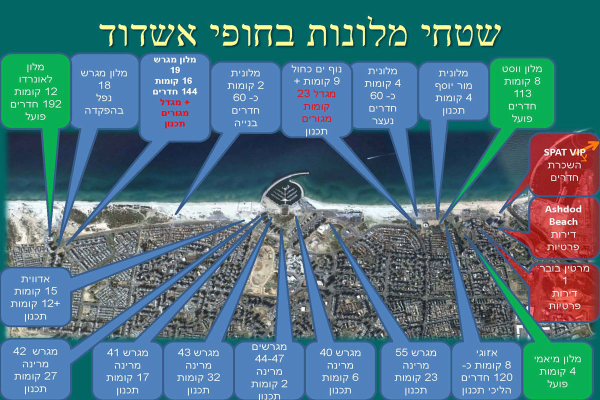 במסיבת העיתונאים שקיים השבוע הפורום הציבורי לאיכות הסביבה באשדוד, נידונו שלושה נושאים עיקריים – המלונות על רצועת החוף, הבנייה בפאתי הדיונה וצפיפות הבנייה ברבעי העיר. בהקשר לנושא הראשון הועלו על ידי יושב ראש הפורום, בועז רענן, התוספות המתוכננות של קומה אחת בשני בתי מלון בחוף לידו. התוספות שאושרו על ידי הוועדה המקומית לתכנון ולבנייה יידונו על ידי ועדת הוולחוף (הוועדה לשמירה על החופים). במגרש מספר ארבעים באזור המרינה אושרה על ידי הוועדה המחוזית תוספת גובה של שלוש קומות וקומה טכנית. התוכניות ממתינות לדיון בוולחוף שלאחריו הן יופקדו להתנגדויות הציבור. על שני מגרשים ממזרח לכיכר עין השמש המיועדים לתיירות בלבד, מתוכננים להיבנות מגדלים. בכל אחד מהם מגדל למגורים ומגדל למלון החורגים כולם מעבר לבנייה שמסביב לכיכר. תוכניות אלו אושרו בוועדה המחוזית והן מצויות בשלב שלפני הפקדתן להתנגדות הציבור. הפורום לאיכות הסביבה יגיש את התנגדותו לחמשת התוכניות שהוזכרו אשר יש בהן כדי לפגוע בסביבתם ובאיכות חיי התושבים.