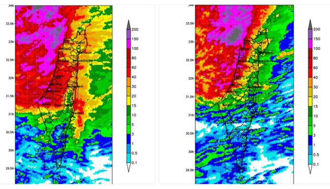 מצורפות מפות המשקעים המצטברים החזויות עד יום ו׳ מהמודלים ברזולוציה גבוהה של השירות המטאורולוגי.
