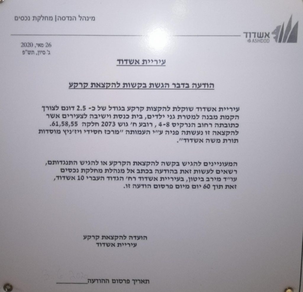 לפני כשבוע נתקלו כאמור כמה מהדיירים בקול קורא שפורסם בו הוגשה בקשה ע״י ״מרכז חסידי ויז׳ניץ מוסדות תורת משה אשדוד״ להקים בשטח (המחולק ל-3 גושים) גני ילדים, בית כנסת וישיבה לצעירים, מדובר בגוש 2073 חלקה 55, 58 ו-61.