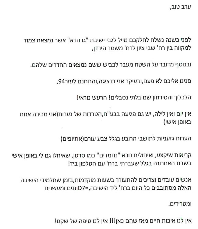 יו״ר האופוזיציה קורא לראש העיר בהצעה לסדר בישיבת המועצה הקרובה, עיריית אשדוד החליטה להקצות קרקע באשדוד לעמותת "גרודנא" המשתייכת לפלג הירושלמי ונחשבת, על פי הפרסומים, לאחת הפלגים הקיצוניים במגזר החרדי. תושבי רחוב שבי ציון קובלים על יחס מחפיר מצד תלמידי הישיבה הנוהגים באלימות כלפיהם, על הפרעה לחייהם הסדירים על בסיס יום יומי, על רעשים, על אלימות מילולית ועוד מעשים שלא ניתן לעבור עליהם על סדר היום ולראיה, מצ"ב מייל ממספר תושבים ושנשלח לחברי המועצה, המתאר, במקצת את המתרחש וכן את המענה של מנכ"ל העירייה בו נרשם, כי הנושא בטיפולו.