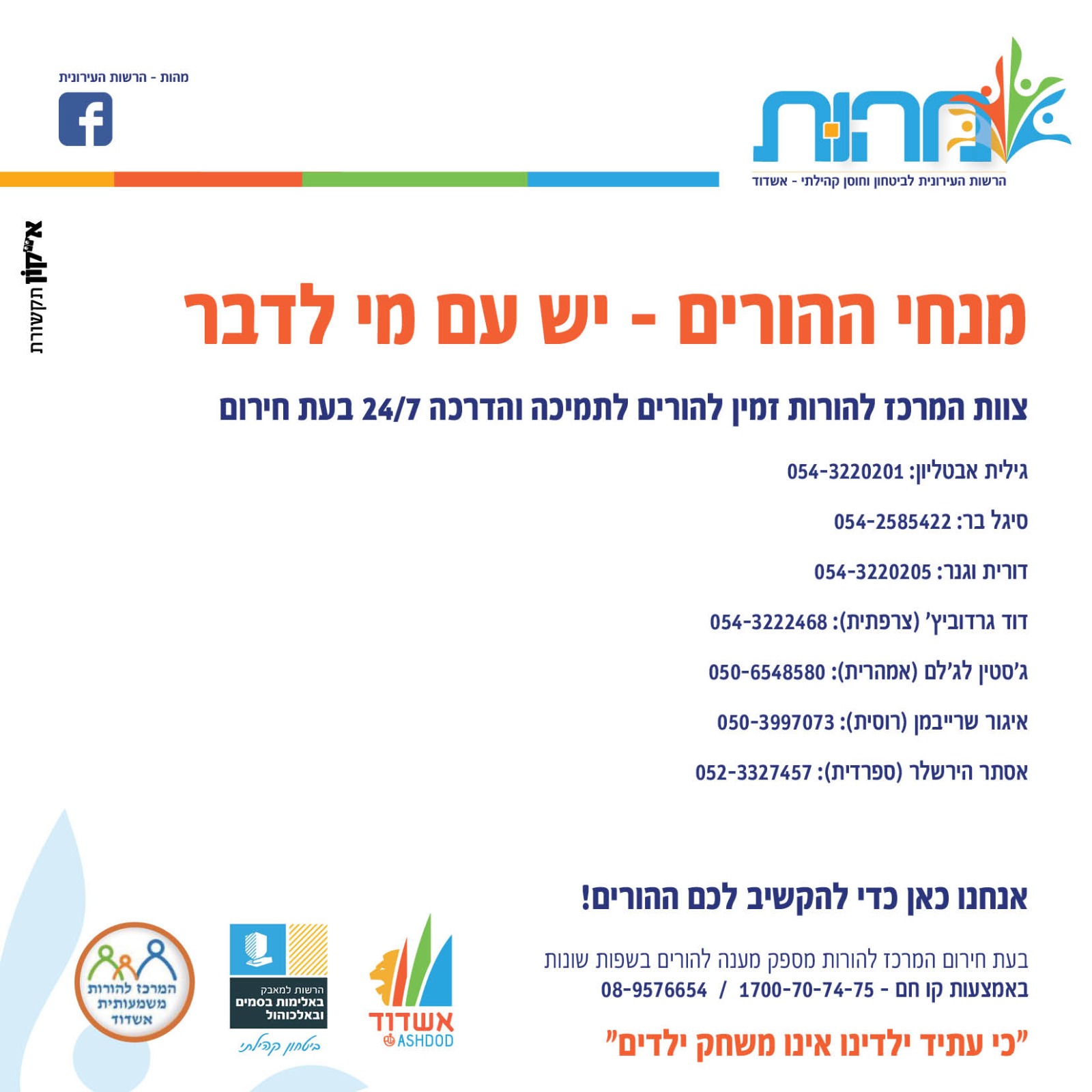תוך שעות ספורות פורסמו מספרי טלפון של מדריכות הורים מוסמכות הנותנות ייעוץ מקצועי ראשוני במגוון רחב של שפות: רוסית, צרפתית, אמהרית, ספרדית וכמובן עברית.