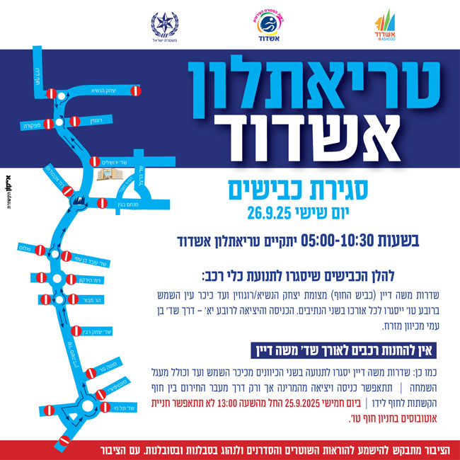 רשות הספורט באשדוד בשיתוף משטרת ישראל מודיעה על סגירת כבישים לרגל טריאתלון אשדוד שיתקיים ביום שישי, 26.9.25, בין השעות 05:00 ועד 10:30 בבוקר.