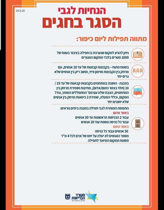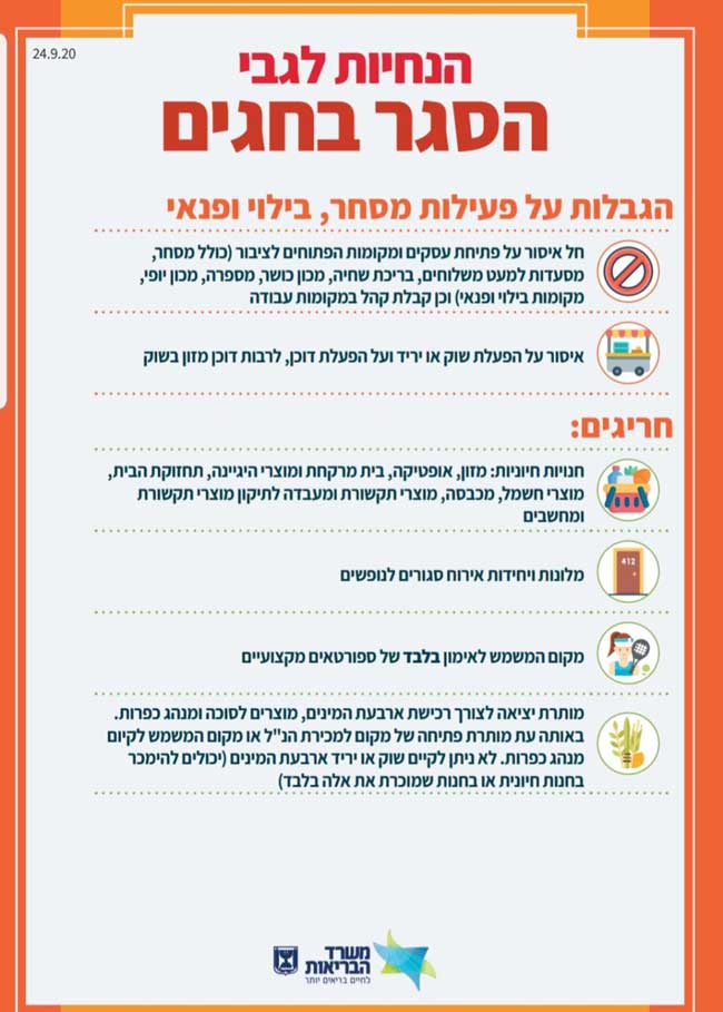 לקראת יום הכיפורים וחג הסוכות, שיחולו בשבוע הבא, ניתן יהיה לצאת לצורך רכישת ארבעת המינים, מוצרים לסוכה או כדי לקיים את מנהג הכפרות. מותר יהיה לפתוח מקומות לצורך מכירת דברים אלה או מקום המשמש לקיום מנהג הכפרות. עם זאת, קיום שוק או יריד ארבעת המינים אסור בהחלט.
