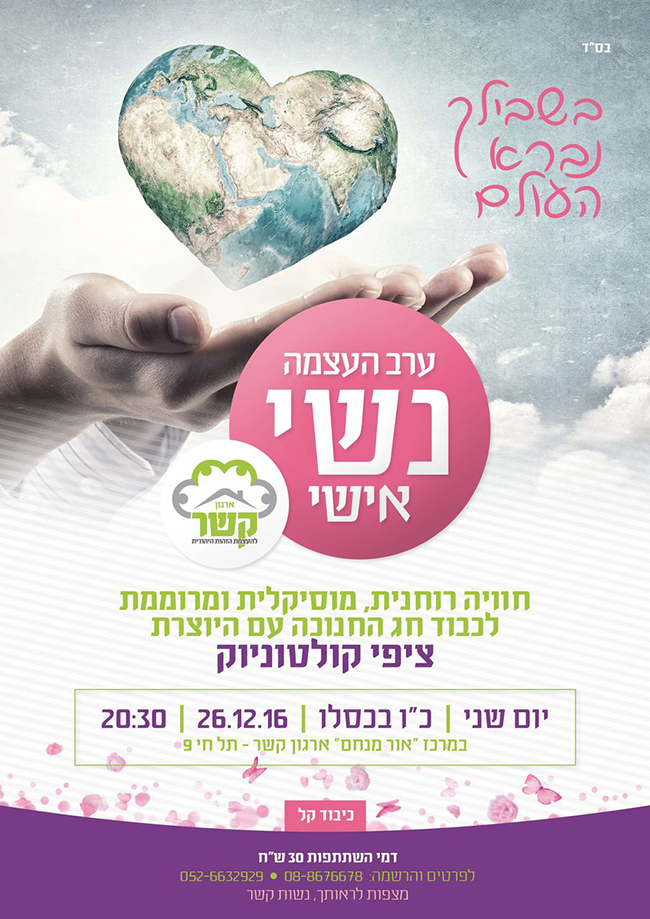 יום ב'  |  שעה 20:30  |  מרכז "אור מנחם" ארגון קשר  |  דמי השתתפות: 30 ₪  |  כבוד קל